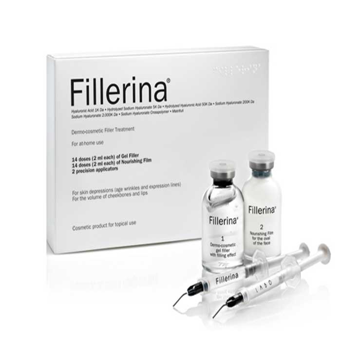 Fillerina dermo-kozmetički filer tretman za kućnu upotrebu je poseban kozmetički tretman koji traje 14 dana. Ključnu ulogu ima Fillerina Gel koji se nanosi posebnim aplikatorom sa tupom kanulom na djelove lica koji su pretrpjeli promjene nastale starenjem i mimičkim pokretima lica kao i na ona područja lica kojima treba povećati volumen (jagodice i usne). Formulacija Fillerina Gela spaja 6 različitih hijaluronskih kiselina, različite molekularne težine, (od 1000 Dalton do 2 000 000 Dalton) i strukturu, koja ima dermo-kozmetičko djelovanje koje popunjava nekoliko slojeva kože. Aktivni sastojak Matriful poboljšava strukturu kože i njenu rekonstrukciju i utiče na povećanje volumena. Da bi kompletirali tretman, nanesite hranljivi serum poslije Fillerina Gela kako bi koža mogla u potpunosti da iskoristi sve benefite obnavljajućih i hranljivih sastojaka. Savršena kao dnevna i noćna njega, čini kožu sjajnom i svilenkastom.