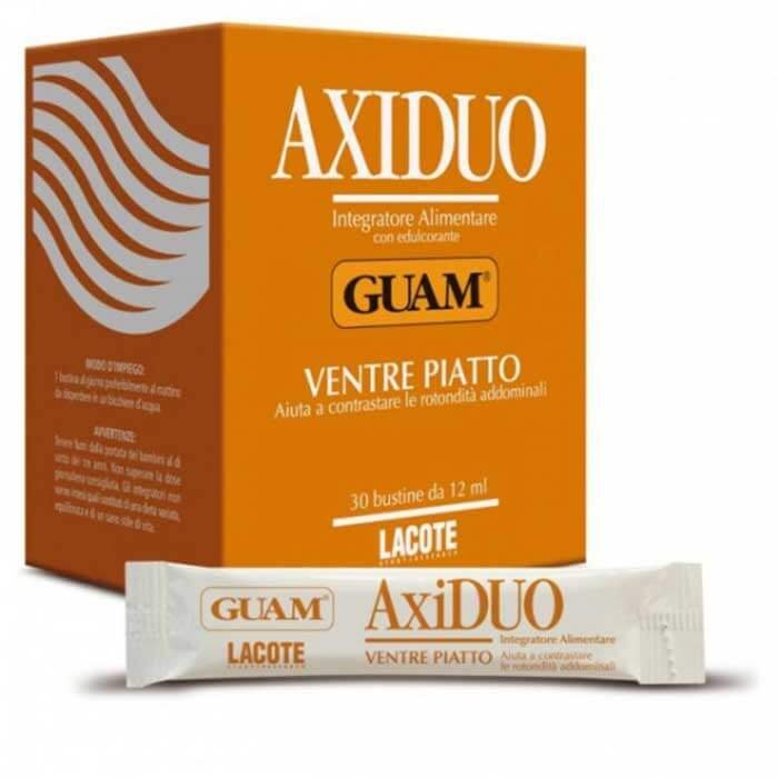 Guam Axiduo je dijetetski preparat. Sa ekstraktima mirođije, origana, drveta magnolije i smeđom algom pomaže smanjenju nadutosti, gasova, pročišćavanju i boljem metabolizmu.