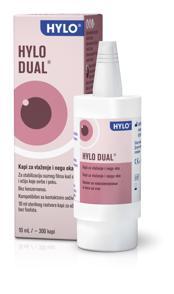 Hylo Dual kapi za oči, 10 ml namijenjene su ublažavanju simptoma suvog oka i alergijskih reakcija oka. Posebno su pogodne za osobe koje imaju osjećaj suvoće, peckanja, svraba, crvenila ili prisustva stranog tijela u oku, naročito kod alergija i povećane osjetljivosti očiju.